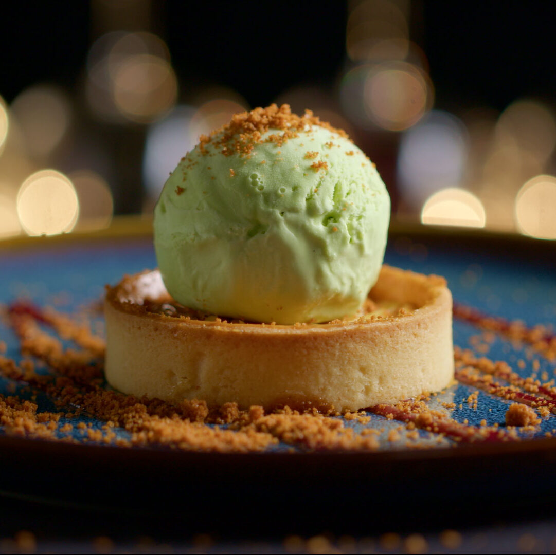 Serveret med pistacieis, solbærsauce og bastogne-crumble