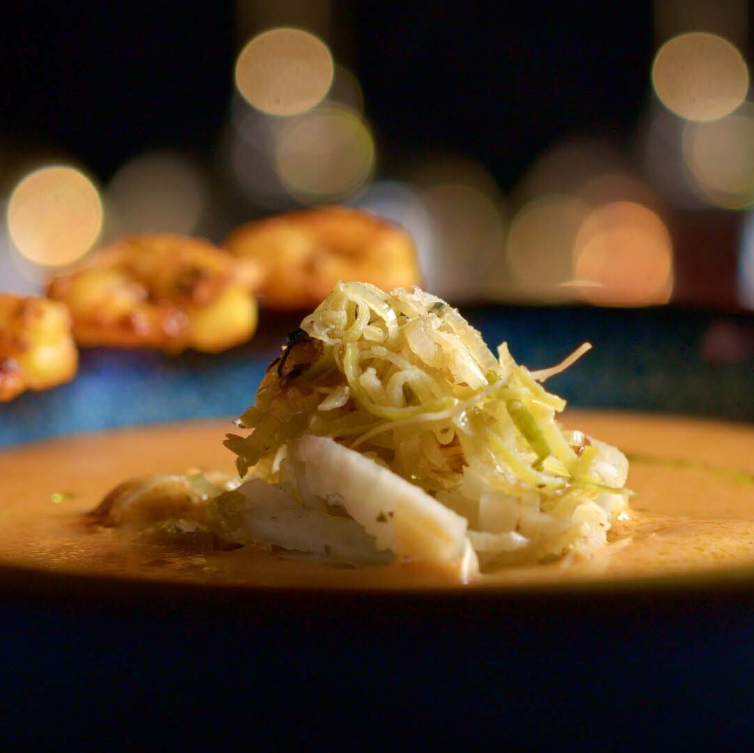 Serveret med tigerrejer på spyd, syltet fennikel og lynstegt porre